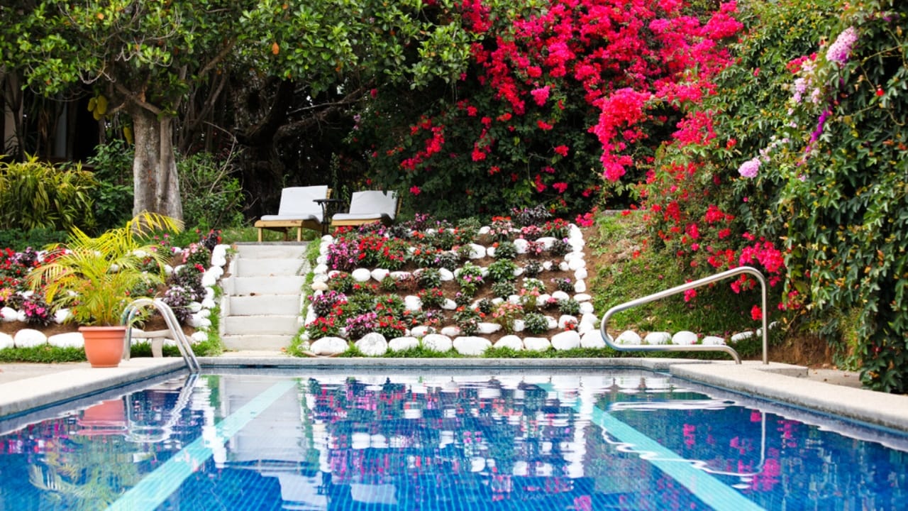The plant’s drought tolerance makes it ideal for hot poolside conditions.