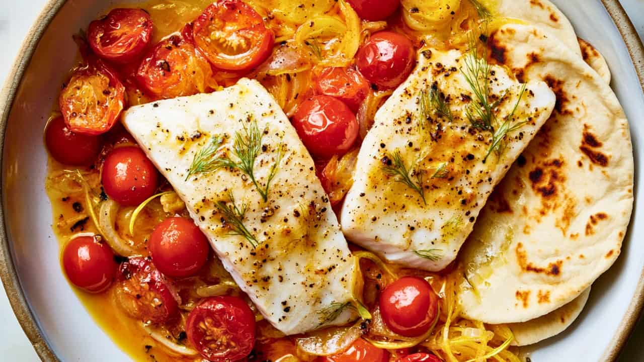 15 Min Mediterranean Fish with Saffron-Infused Tomatoes - Fish Recipe with Saffron Cherry Tomatoes midia