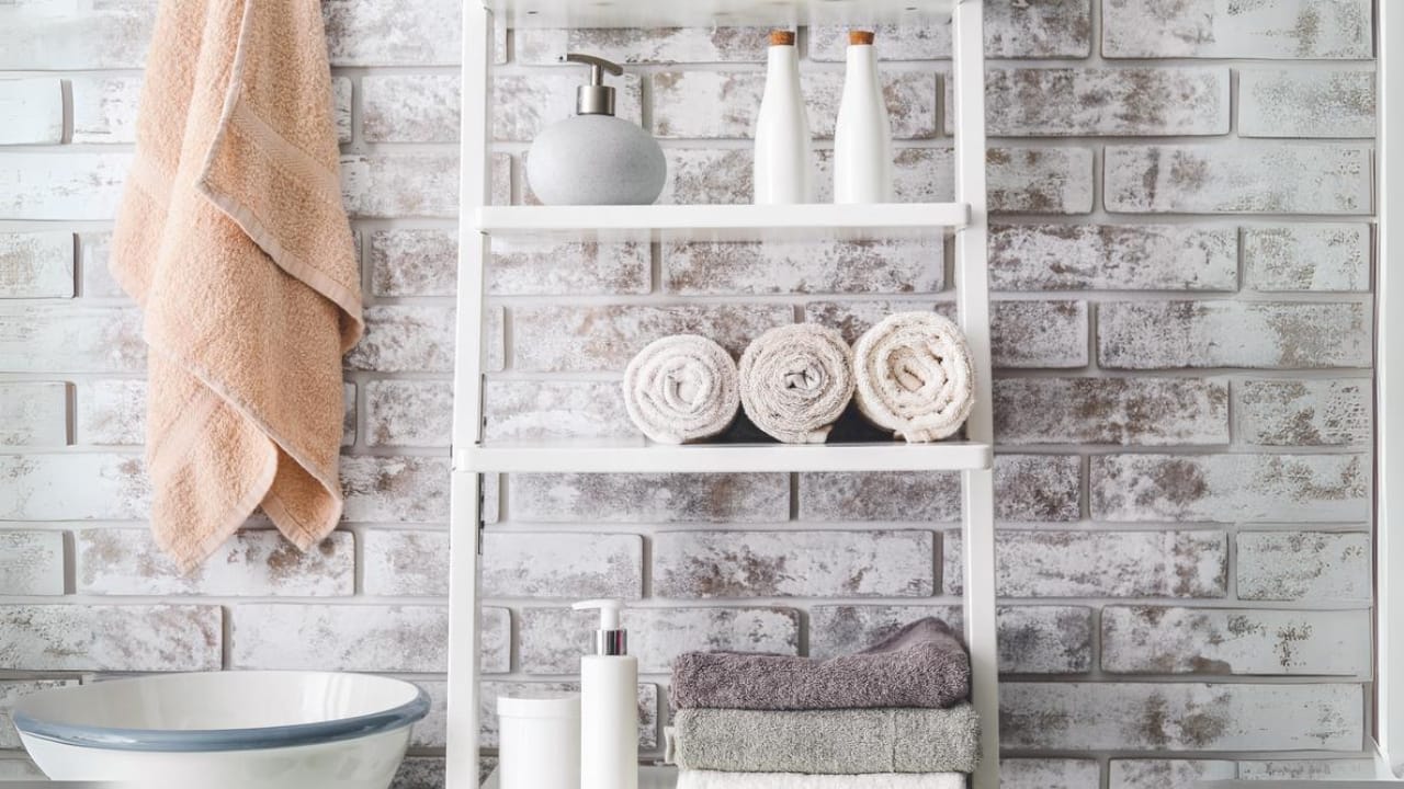 Install a decorative ladder against a wall to hang towels and washcloths. This trendy storage solution not only keeps your towels organized but also adds a stylish element to your bathroom decor.