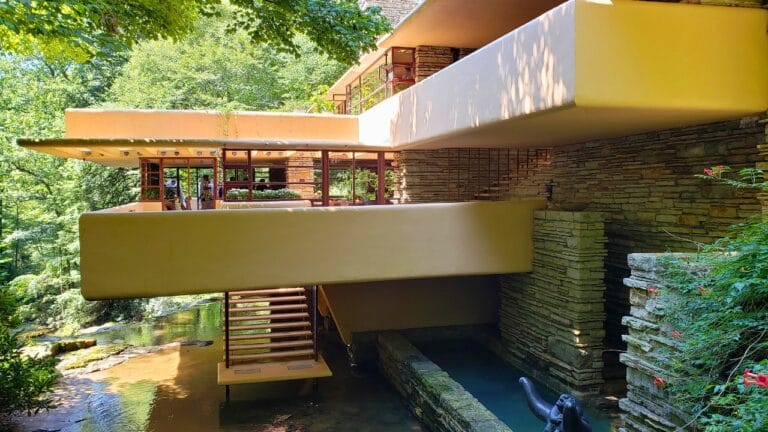 Fallingwater is one of Frank Lloyd Wright’s most celebrated works, renowned for its dramatic integration with the natural landscape. Built over a waterfall, the house features cantilevered terraces that extend out over the stream below.