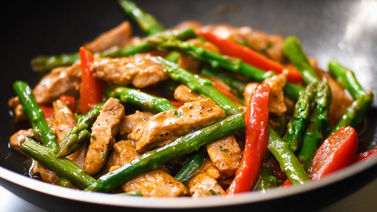 - Stir-Fry the Vegetables: In the same skillet, heat the remaining 2 teaspoons vegetable oil over high heat until just smoking. Add asparagus and red bell pepper, cooking while tossing constantly until tender and slightly browned, about 2 to 6 minutes.