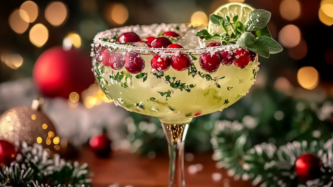 This festive twist on a classic margarita combines smooth tequila with bright cranberry juice and citrus notes, creating the perfect holiday cocktail. The drink is rimmed with sparkling sugar or salt and garnished with fresh cranberries, lime, and mint for a stunning presentation that captures the spirit of the season.