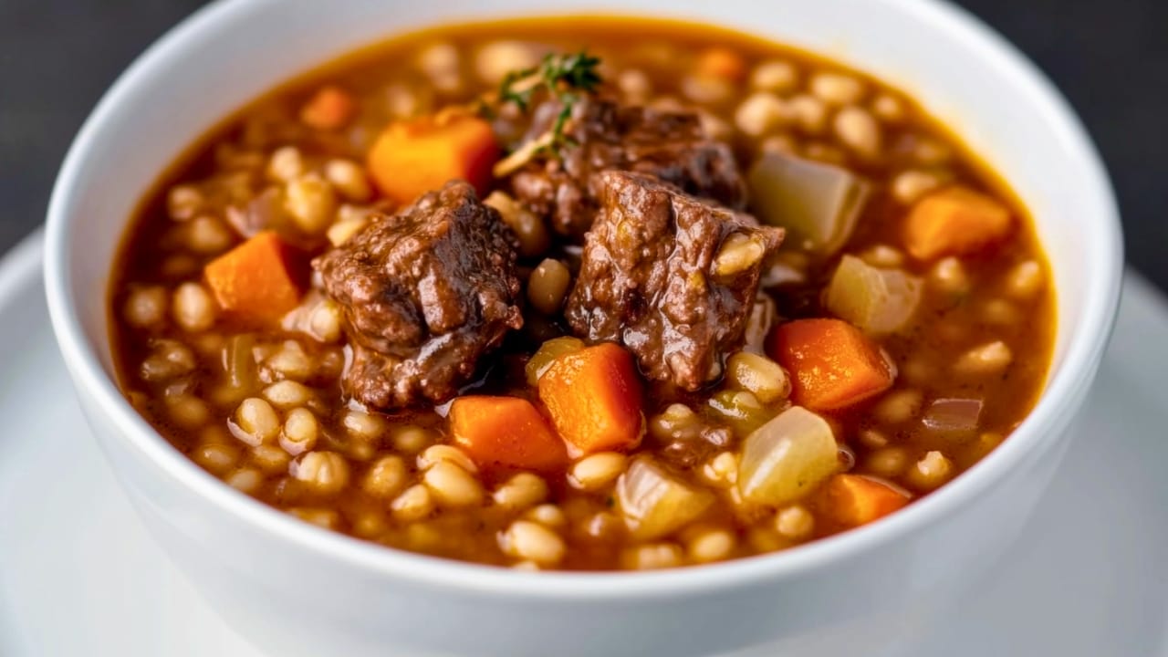 It’s packed with tender chunks of beef, wholesome barley, and a medley of vegetables, all simmered together in a rich, savory broth.