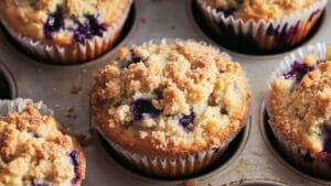 The combination of fresh blueberries and a buttery crumb topping makes these muffins a standout choice for any occasion.