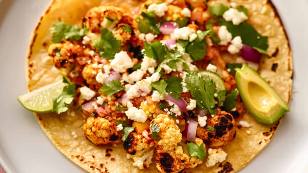 - Assemble the Tacos: Spread a layer of mashed avocado on each tortilla, add the roasted cauliflower mixture, and sprinkle feta cheese on top. Slice the remaining lime into wedges and serve alongside the tacos for squeezing.