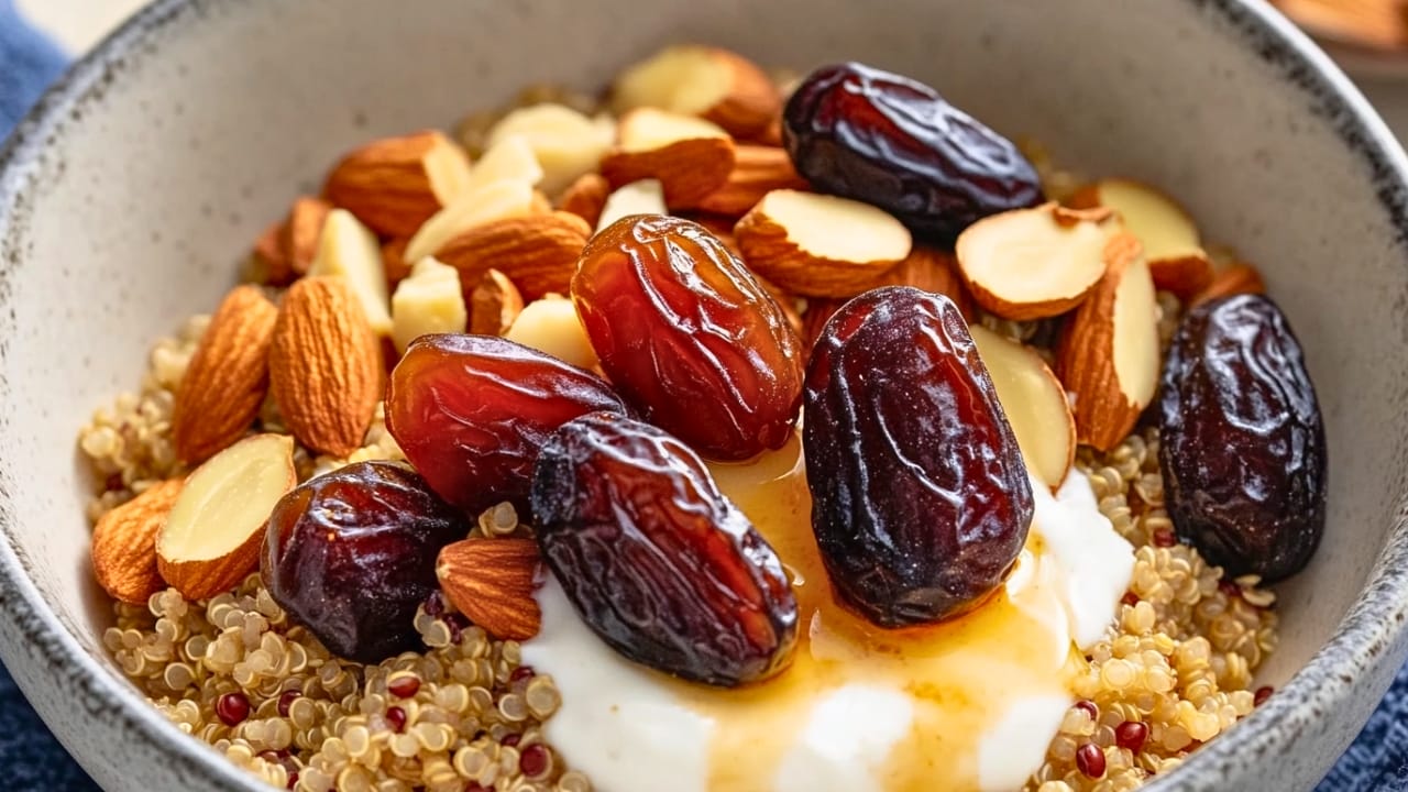 Tired of the same old breakfast routine? This quinoa breakfast bowl with yogurt, dates, and almonds offers a refreshing change with a balance of protein, fiber, and natural sweetness.