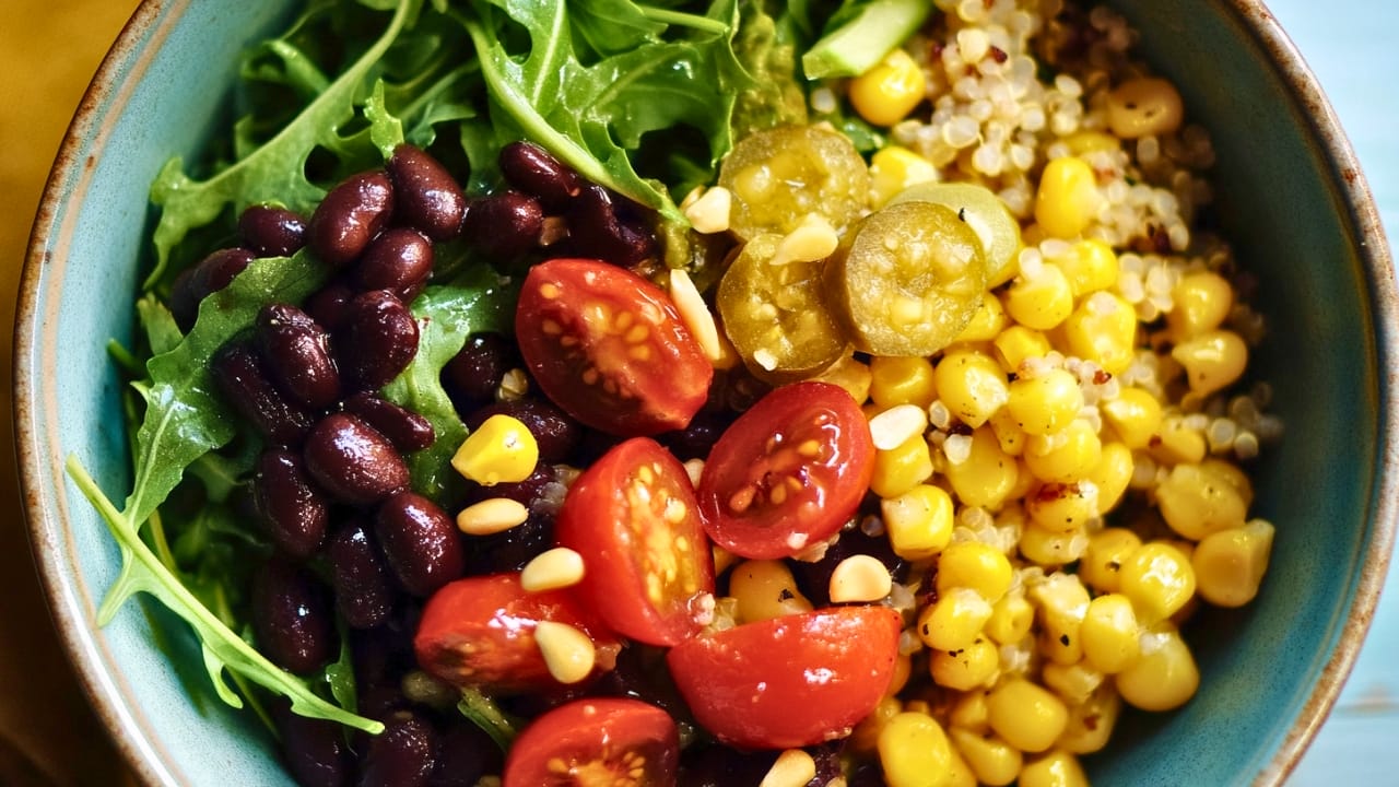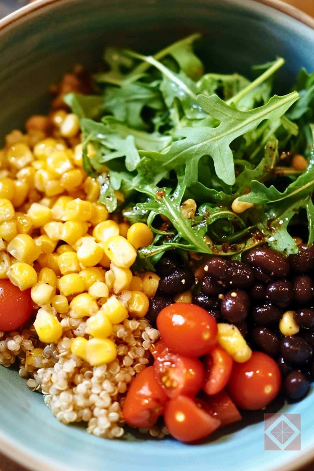 - Prepare the Bowls: Distribute the warm grains evenly among four serving bowls. Arrange the corn, arugula, halved cherry tomatoes, black beans, and avocado slices (if using) over the grains in separate sections for a colorful presentation.