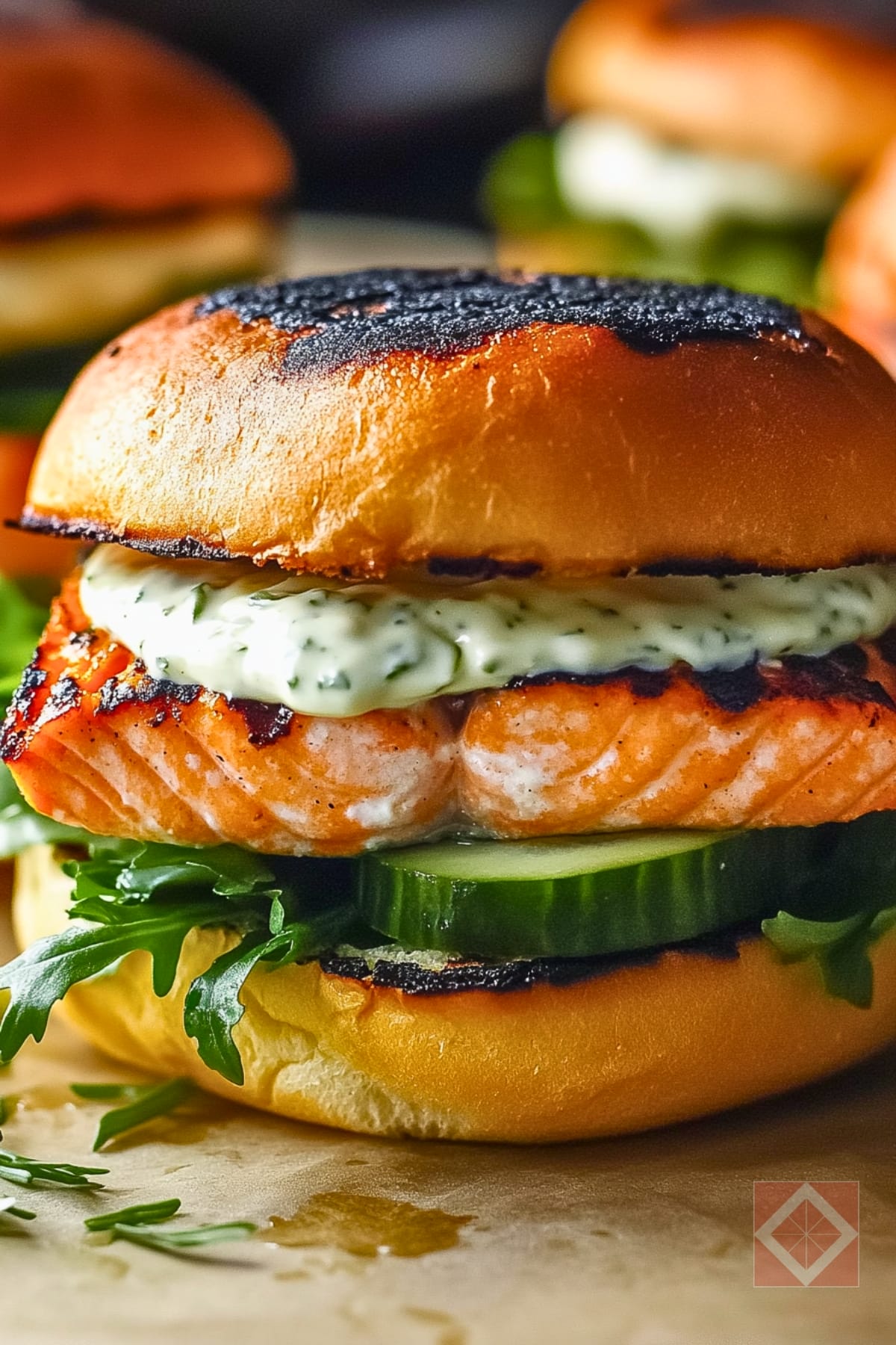 - Assemble the Sandwiches: Spread a generous layer of the lemon aioli on the bottom halves of the toasted buns. Add a handful of spring greens and layer on the cucumber slices. Place a grilled salmon fillet on top, then finish with the top bun.