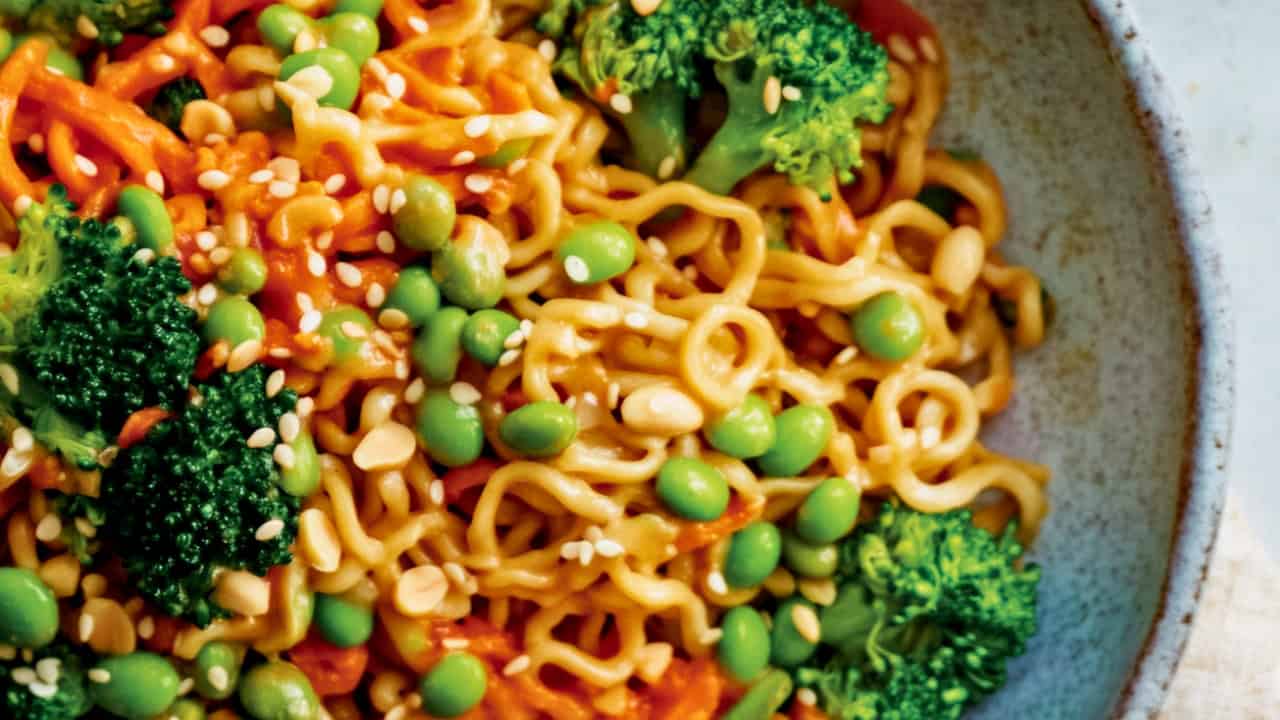 - Transfer the drained noodles and vegetables to a large mixing bowl. Pour the prepared peanut sauce over them and toss well until everything is evenly coated. If you prefer a saucier dish, add more of the peanut sauce. If the noodles seem too thick or sticky, mix in a small splash of water until you reach the desired consistency. Serve in bowls and garnish with your favorite toppings.