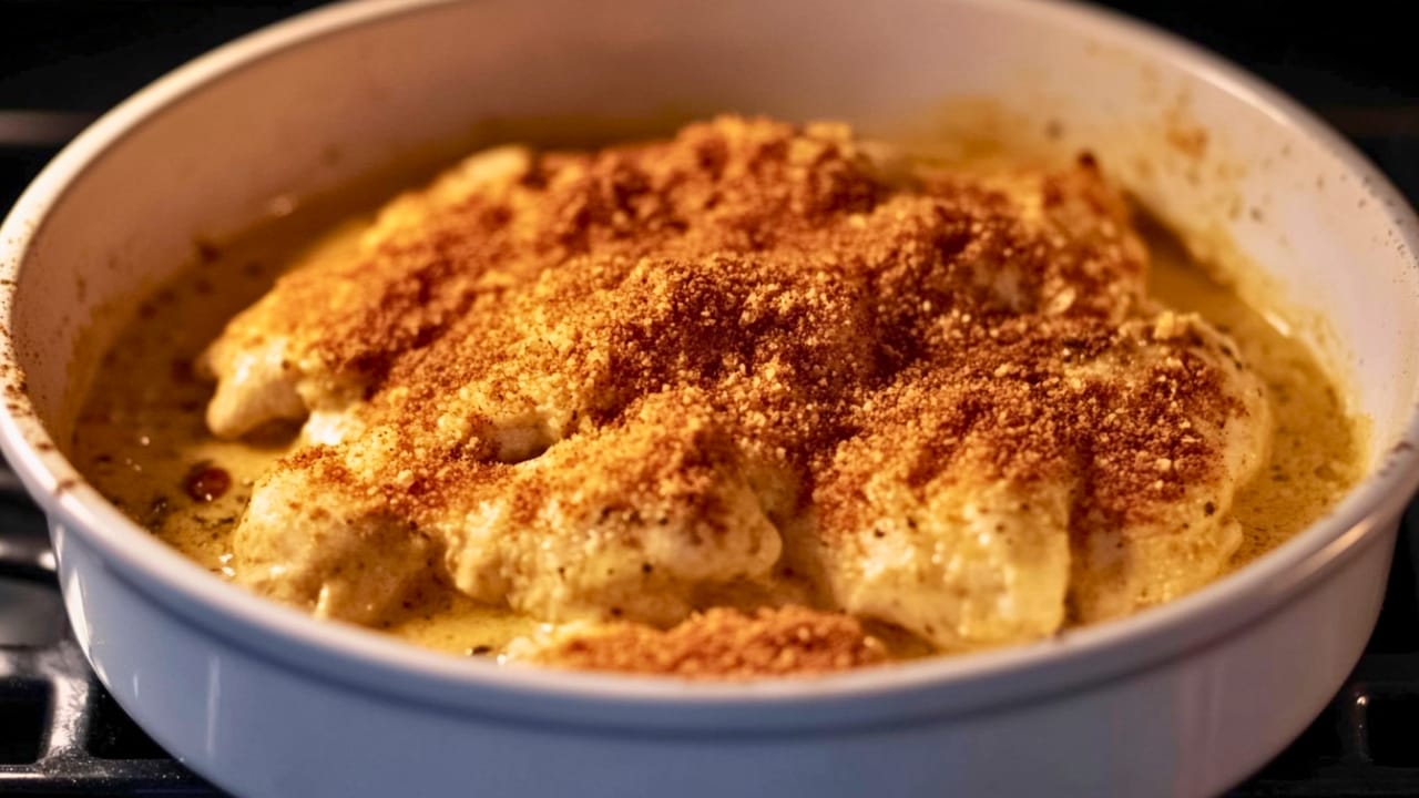 - Broil the Topping: In a small bowl, mix breadcrumbs and Parmesan cheese. Sprinkle the mixture evenly over the chicken and add a few extra shakes of oregano. Place the casserole under the broiler for 2-3 minutes, watching closely to prevent burning.