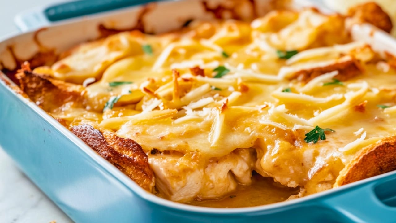 - Assemble the Dish – Place the cooked chicken fillets over the bread in the casserole dish. Spoon sauce over the chicken and add a slice of Swiss cheese on top.