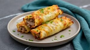 - Assemble the Roll Ups: Remove the baking sheet from the oven. Let the cheese circles cool for 1-2 minutes until they are cool enough to handle but still very pliable. Place a few tablespoons of the beef filling onto one side of each cheese circle. Gently but snugly roll the cheese around the filling, placing them seam-side down to seal as they cool.
