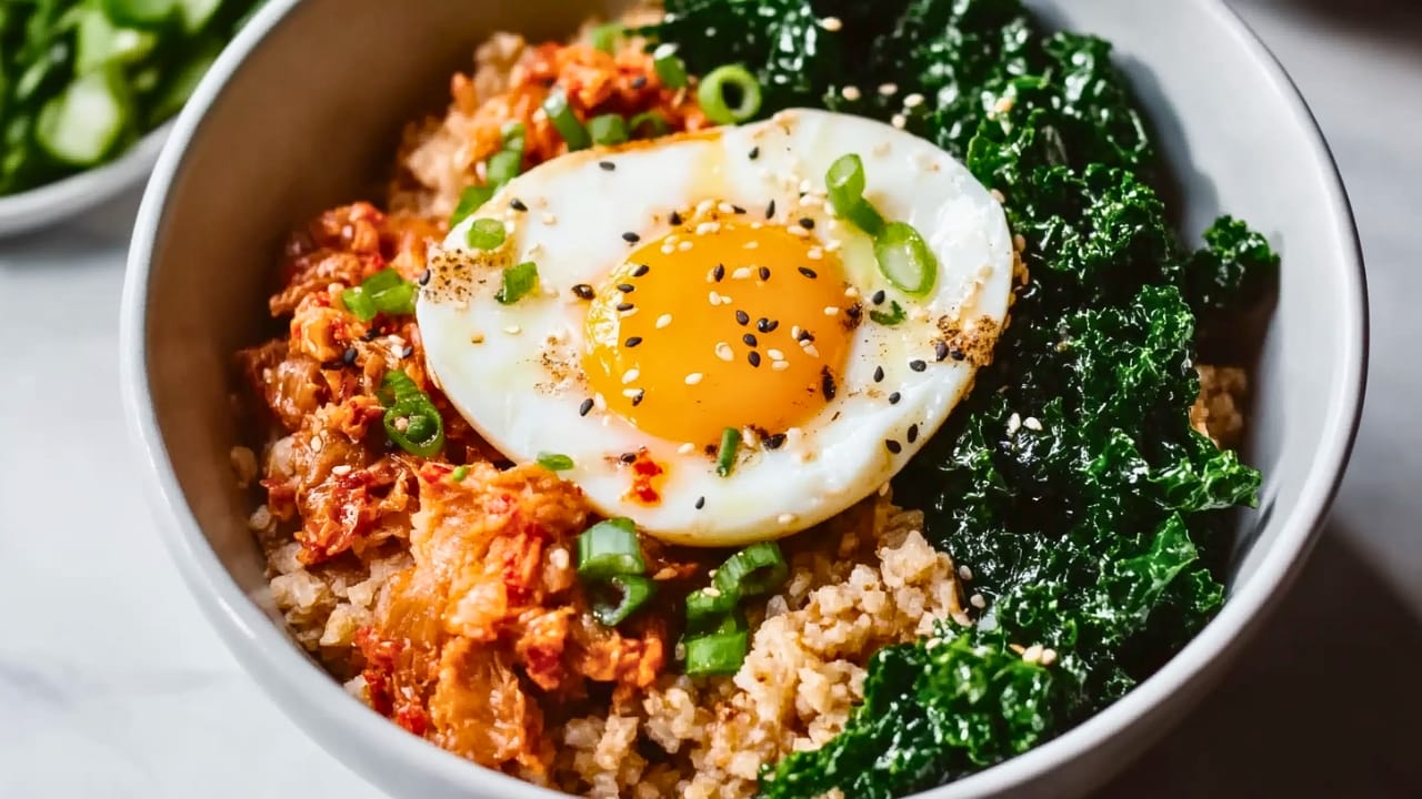 - Assemble the Bowls: Divide the cooked grains evenly among four serving bowls. Arrange the steamed kale on top of the grains in small mounds. Add slices of avocado next to the kale, and then cut the peeled eggs in half and place two halves in each bowl. Sprinkle each bowl with kimchi, sliced scallions, sesame seeds, and, if desired, crumbled seaweed.