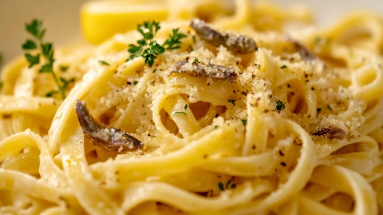 This recipe is ideal for weeknight dinners when you want something quick yet satisfying. The combination of anchovies and lemon butter sauce creates a rich, savory base that pairs perfectly with fettuccine.