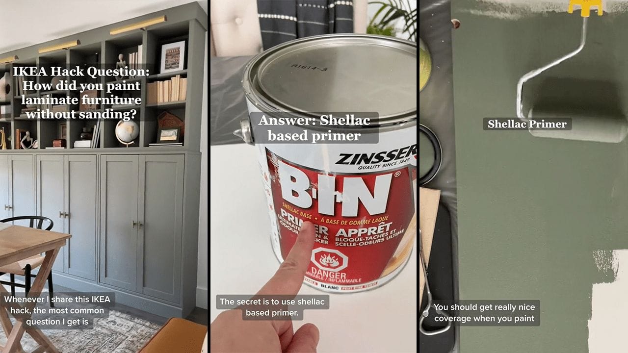 Her secret to painting IKEA laminate furniture without sanding is none other than a Shellac-based primer.