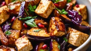 This dinner recipe combines crispy, caramelized eggplant with pomegranate-glazed tofu for a sweet, tangy, and savory flavor combination.