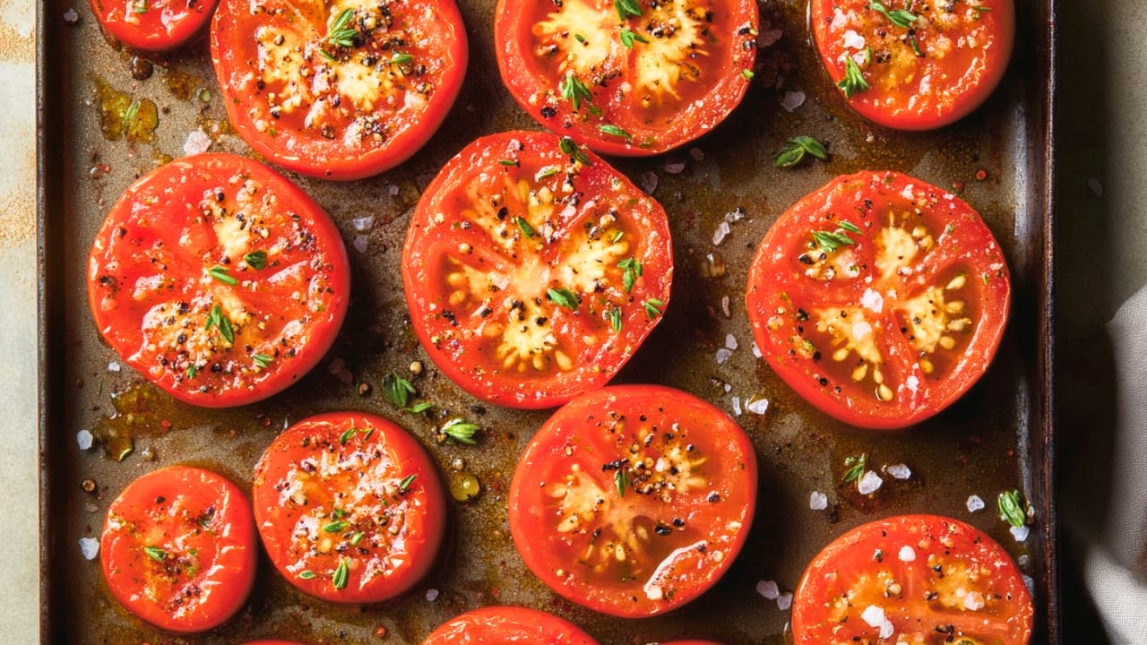 - Slice the tomatoes into ½-inch thick rounds (about 4–5 slices per tomato) and arrange them in a single layer on the prepared baking sheet.