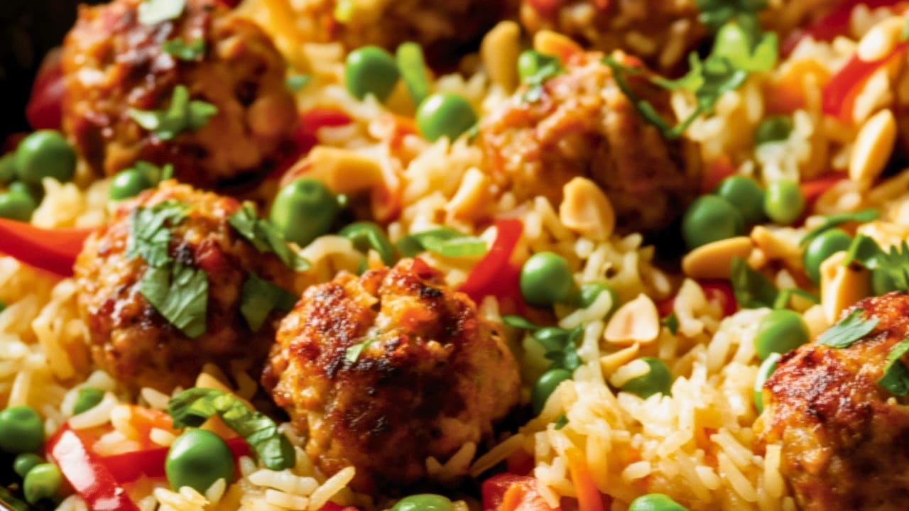 Tender meatballs nestled in a bed of creamy coconut rice and vibrant vegetables make this dish perfect for busy weeknights or a relaxed dinner at home.