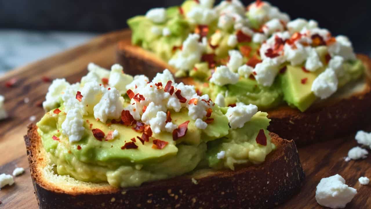 - Assemble the Toppings – Evenly spread the mashed avocado over the toasted bread. Sprinkle the crumbled goat cheese on top, followed by red pepper flakes, salt, and pepper.