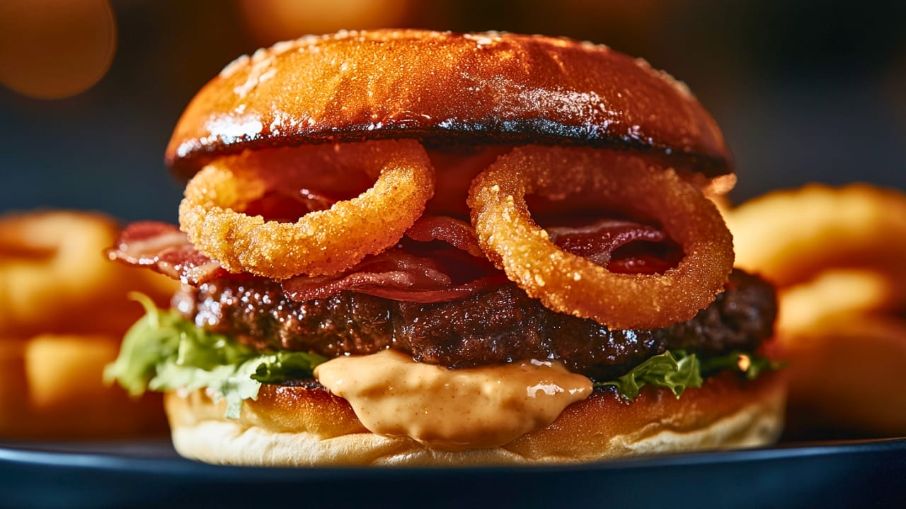 The addition of homemade crispy onion rings truly elevates these burgers. They’re light, crunchy, and perfectly seasoned to complement the juicy beef patties.