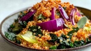 - Build the Salad: Combine roasted kale and cabbage in a large bowl. Add in the agrodolce onion mixture and toss to coat. Top the salad with crunchy quinoa just before serving.