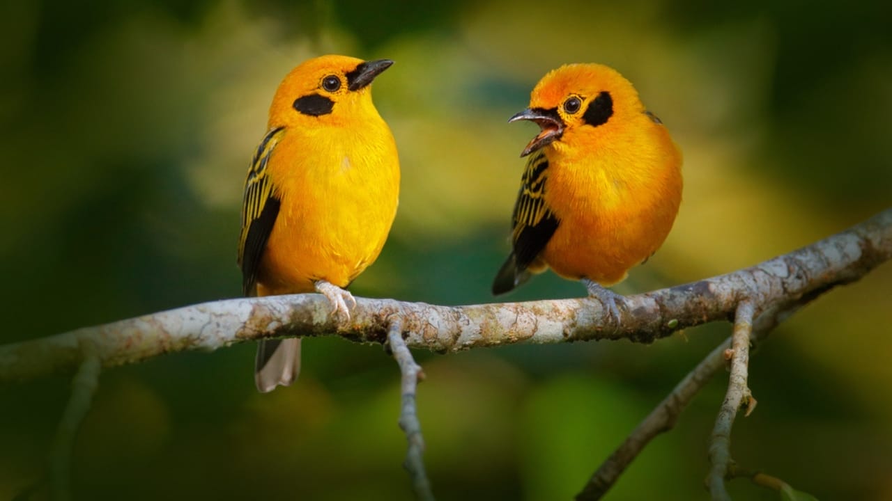 The Golden Tanager is predominantly yellow with black markings on its wings and tail. Found in humid forests in countries like Colombia, Ecuador, and Peru, it thrives in montane forests.