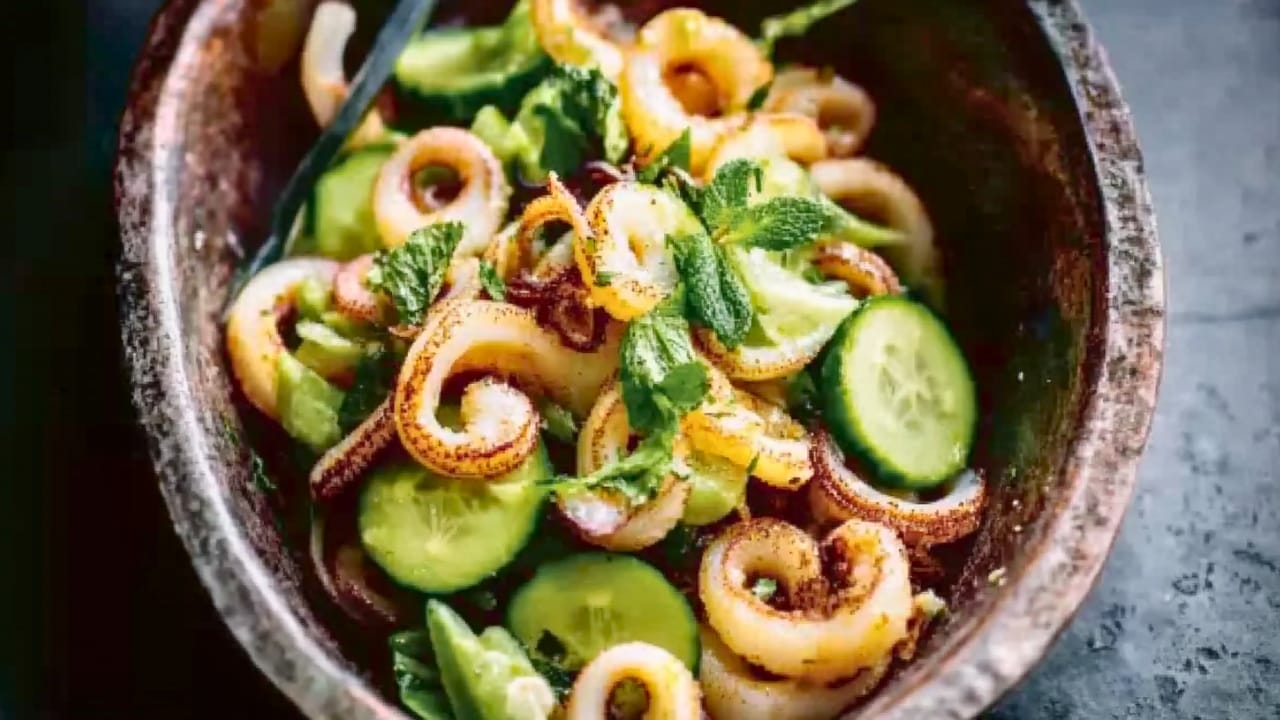 - Drizzle fresh lemon juice over the cooked squid. In a large bowl, toss the squid with the thinly sliced cucumber and torn mint leaves.