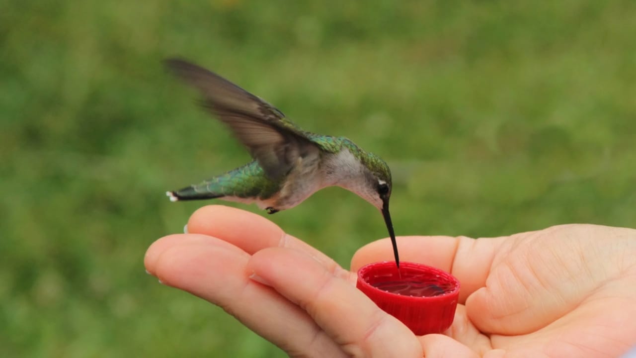 Instead of relying on artificial coloring, opt for a feeder with red parts or tie a red ribbon around it to catch the attention of passing hummingbirds. The birds will be drawn to the color and the sweet scent of the plain sugar water, making additional coloring completely unnecessary.