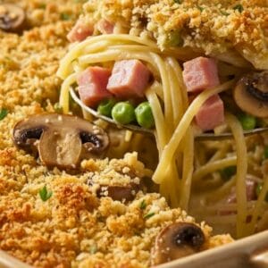 Melt & Mix: Remove pan from heat. Stir in the Swiss/Gruyère cheese, black pepper, and nutmeg until smooth. Fold in the cooked pasta, cubed ham, and peas. Taste and add salt if needed (ham is salty, so taste first!).