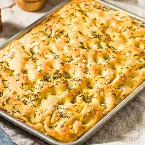 Dimple: With oiled fingers, poke deep holes all over the dough (touch the bottom of the pan!). Pour the herb oil into the holes and sprinkle with flaky salt.