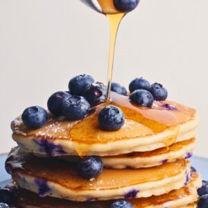 This dessert recipe for blueberry pancakes creates a stack of light, fluffy pancakes filled with juicy blueberries, perfect for a sweet breakfast or dessert treat. With a hint of vanilla and a golden, buttery finish, these pancakes are a delicious indulgence.