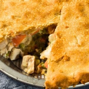 Season and Cool: Stir in the salt and pepper. Taste test now. If your broth was salty, you may need less salt. Stir in the cooked chicken, peas, and parsley. Remove from heat and let the filling cool completely to room temperature. Note: putting hot filling in a raw crust will cause a soggy bottom.