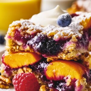 Storage: Store in the fridge up to 4 days or freeze up to 3 months.Fruit Tips: You can use frozen fruit (no need to thaw). For fresh peaches, poach for easier peeling.Market Swap: Use your favorite mix of stone fruit (apricots, cherries) and berries (strawberries, blueberries). For tart fruits, sweeten the filling with more honey.Glaze Option: Mix ½ cup powdered sugar, ½ tsp vanilla extract, and 1 tbsp milk until smooth. Drizzle after the bars have cooled.