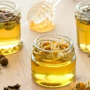 Carefully remove the jar from the water bath and add your chosen herbs directly into the honey.
