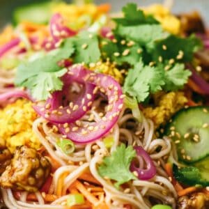 This nutritious and flavorful high-protein vegan recipe is a perfect balance of textures and tastes. Buckwheat soba noodles, crispy crumbled tempeh, and tender edamame are tossed with a zesty spicy sesame dressing, creating a satisfying meal packed with fiber and plant-based protein. With fresh vegetables and a vibrant dressing, this dish is easy to prepare and bursting with flavor.