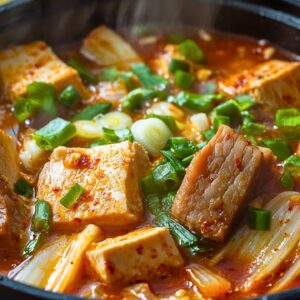Cook the Pork and Aromatics: Heat a sturdy soup pot over high heat and add the peanut oil. Once the oil is hot, add the marinated pork and sear it until browned, about 5 minutes. Lower the heat to medium, add the chopped onion, and cook while stirring until the onion softens, roughly 5 minutes. Mix in the gochujang and gochugaru, cooking for 1 to 2 minutes until the paste turns a deeper red color and its aroma is released.