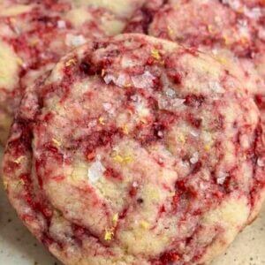 These soft, chewy cookies taste just like raspberry lemonade! Made with real lemon zest, fresh lemon juice, and frozen raspberries, they are the perfect balance of sweet and tart. A quick small-batch recipe that requires no chilling.