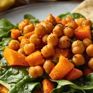 Combine the salad: In a large mixing bowl, add the spinach, roasted vegetables, roasted chickpeas, and shallots. Drizzle the prepared dressing over the mixture and gently toss everything together until the dressing evenly coats the ingredients. Serve immediately for the best flavor and texture.